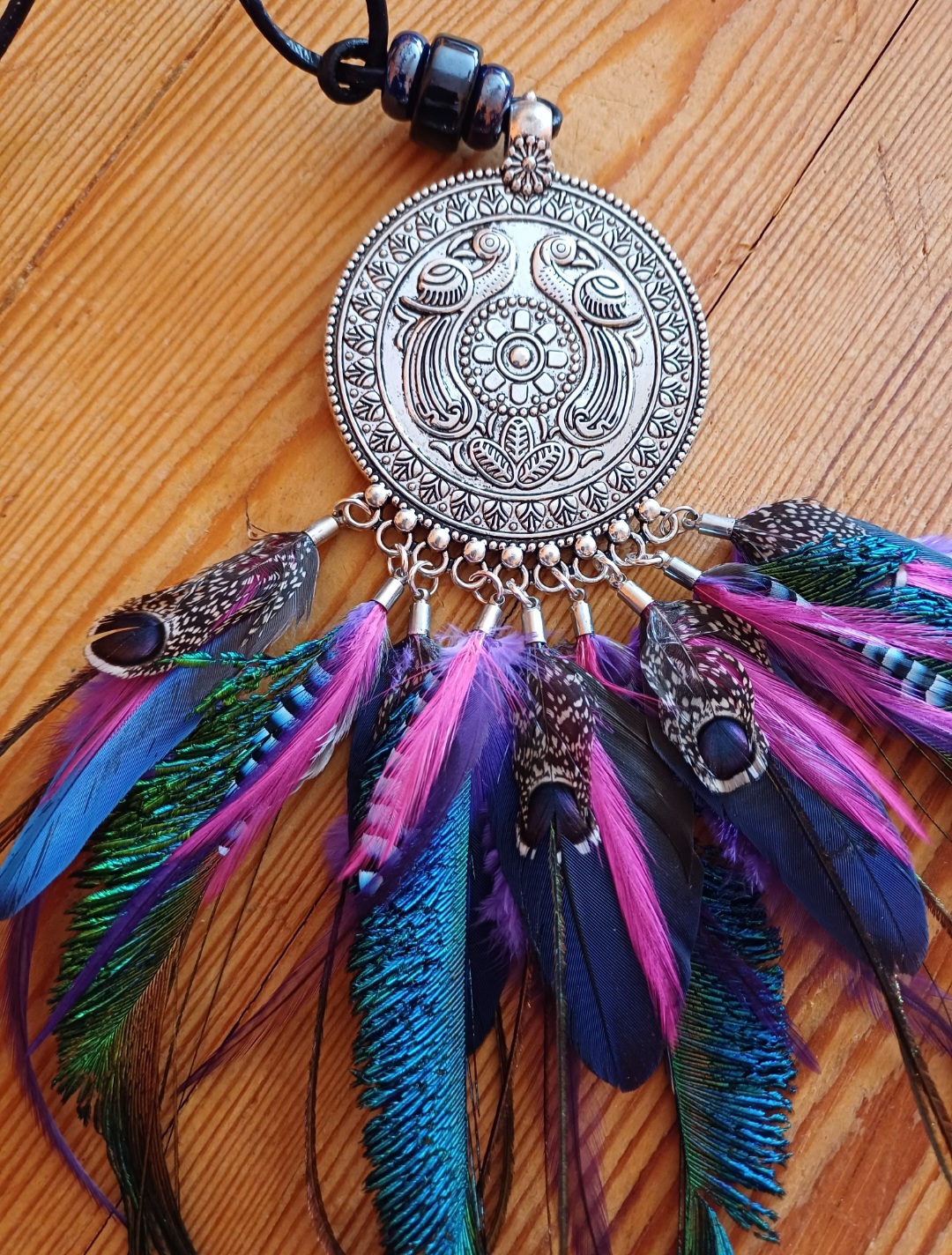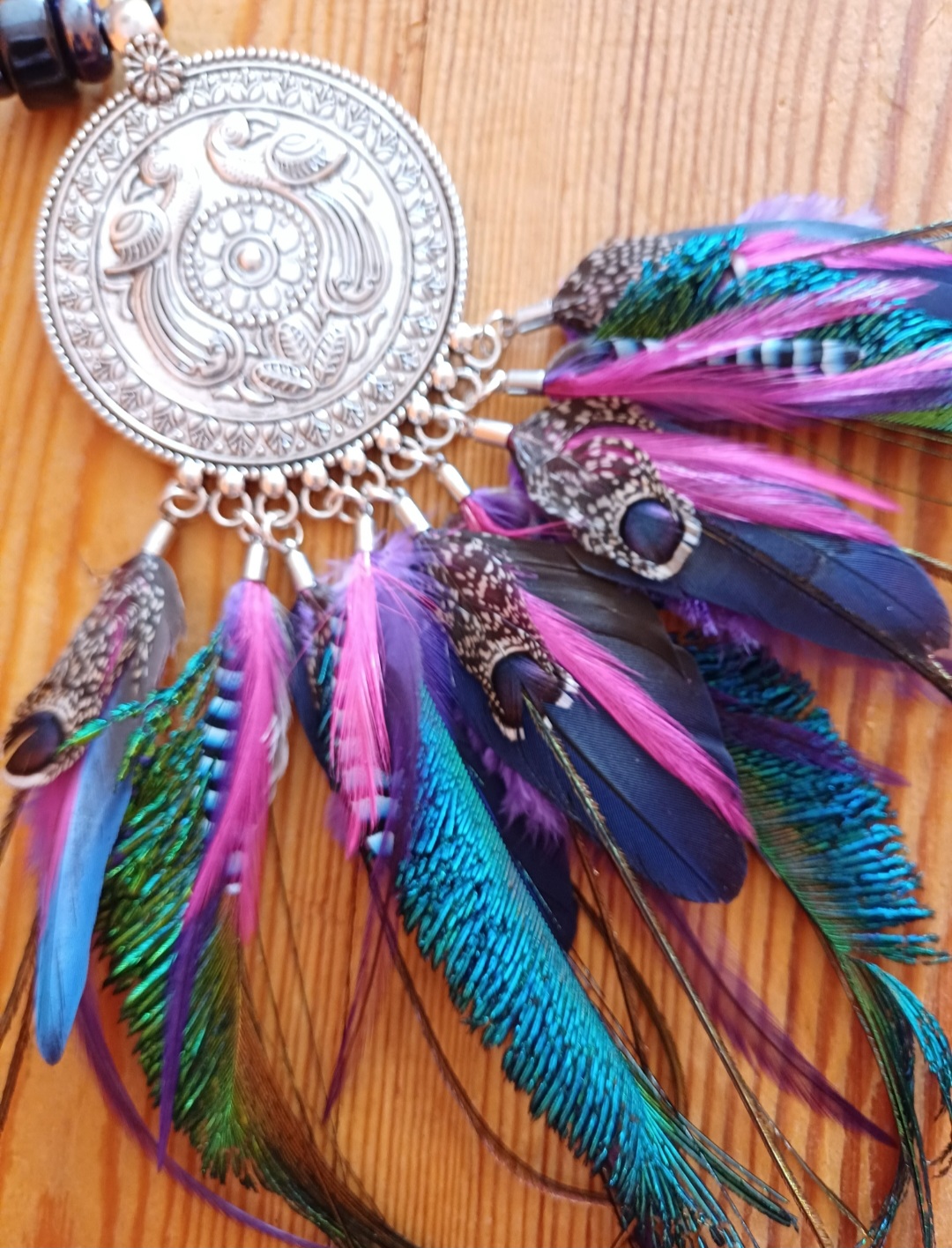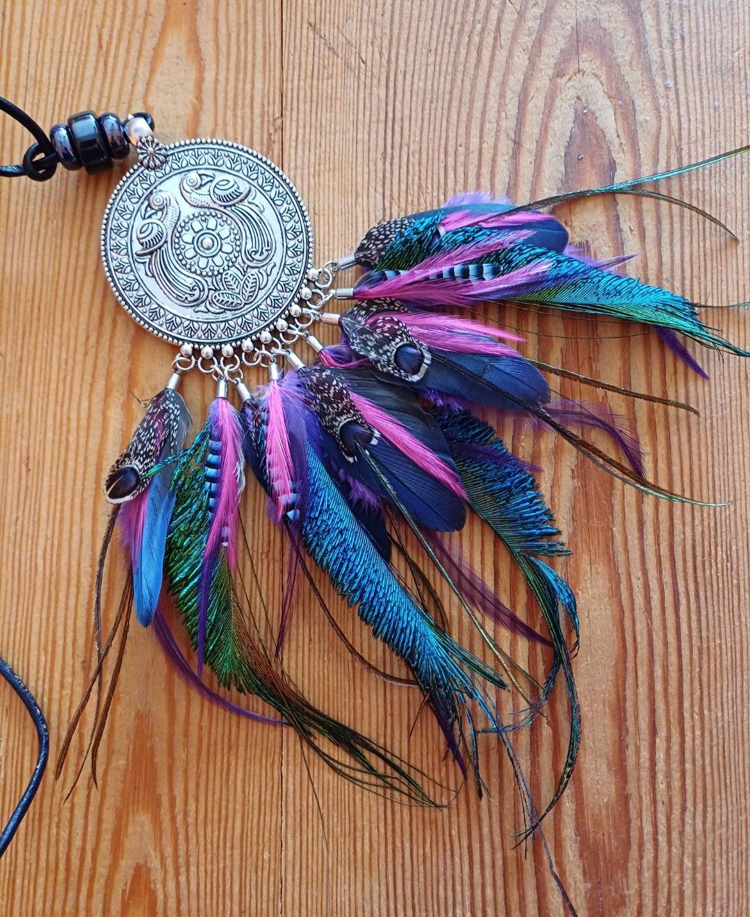 Naszyjnik jest tworzony z naturalnych piór : kogut amerykański, paw, wieloszpon, papuga, sójka